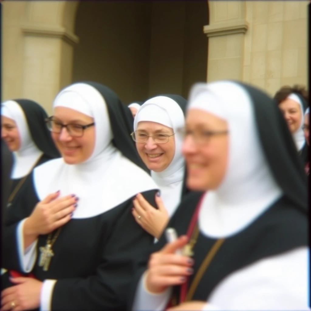 IMG_1018.CR2, Photo, taken from a phone, of nuns having fun at the church. at a distance, half or full body in frame. Grainy, blurry, candid Kodak easyshare snapshot, out of focus and out of frame.