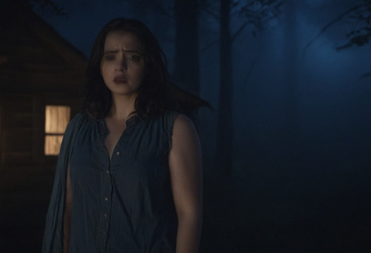 Cinematic frontal wide shot, landscape shot, dark night, full shot close up of dark haired woman standing and looking at someone offscreen, slight frown, scared expression on her face, backside of a large forest cottage with dim light, eerie, legion core, night lighting, muted color tones, dark blue and mahogany color tones, cinestill , fog, clouds, scary scenes,