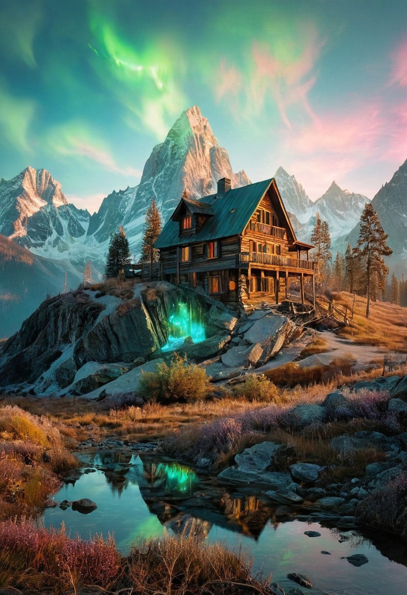 (by Ellen Jewett:1.5), ((Bioluminescent Impressionism: 1.8), The Dreamland), their peaks veiled in mist. mixed media, surrealism, great lighting, A surreal landscape highly detailed . extremely high-resolution details, appears trapped in an optical illusion of reflections and refractions colorful , mountain cabin, ice and snow, professional photography, natural lighting, volumetric lighting maximalist. intricately detailed, complex, elegant, expansive, fantastical, film photography style, medium grain, <lora:MJ52:0.3> <lora:SDXLFaeTastic2400:0.4> <lora:EpicF4nta5yXL:0.7>.ethereal landscapes, depth of field, biotech emotion:1.3) <lora:xl_more_art-full_v1:0.5> <lora:add-detail-xl:1> <lora:RMSDXL_Creative:2>