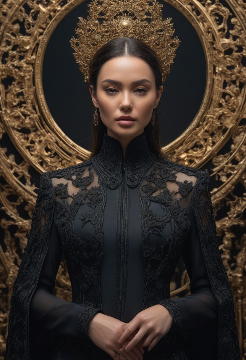 A stunning woman adorned in a sheer black coat, captured in a full body shot with her eyes gently closed during a professional photoshoot. The image is symmetrical and rendered in mesmerizing 8k resolution, resulting in a photorealistic masterpiece created by a skilled photographer. The use of natural lighting enhances the composition, highlighting every intricate detail of the model. This maximalist concept art showcases the complexity of the subject, presenting a visually captivating image with maximum attention to detail.