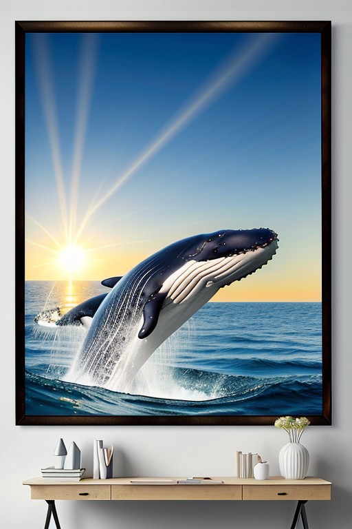 Master level highly detailed whale swimming in the ocean with the sun rays shining down