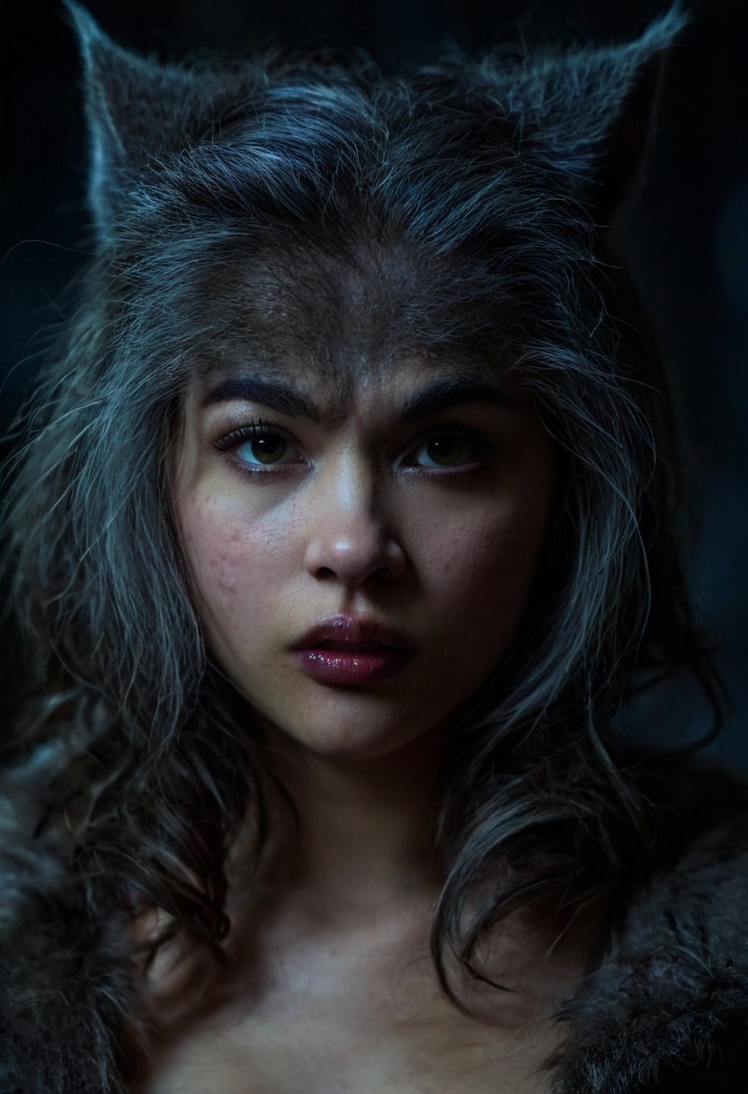 (girl, 4ng3l face), werewolf, professional photo, very detailed and dramatic, expressive cinematic, darkness, bokeh, studio lighting, medium shot, from the waist up, Werewolf style