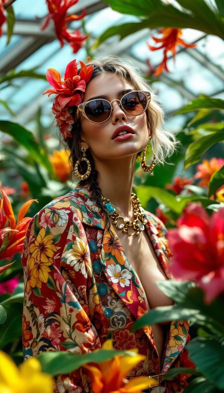 The image should be highly detailed, with a focus on capturing details of the scene. The image should be in 8k resolution, with a sense of hyper-realism and realism. The image should be an unparalleled masterpiece, with a sense of award-winning quality. Photographers like Mario Testino or Steven Meisel, known for their high-fashion work, would excel in capturing this scene. A Canon EOS R5 with a 50mm f/1.2 lens, settings at ISO 100, aperture f/2.8, and a shutter speed of 1/200s to achieve a sharp focus on the model while softly blurring the background. A close-up shot of a model in a vibrant, tropical greenhouse, wearing an eclectic Gucci outfit with bold prints and textures, sunglasses, and chunky jewelry. The lush greenery and exotic flowers create a stunning backdrop, while soft, natural light filters through the glass ceiling, casting dappled shadows on the model’s face, enhancing the luxurious and artistic atmosphere. Captured in a style reminiscent of Mario Testino, using a Canon EOS R5 with a 50mm f/1.2 lens for a highly detailed, photo-realistic composition. The style is high-fashion with a focus on luxury and vibrancy. A close-up composition will highlight the details of the outfit and accessories while capturing the lush background. The theme is "tropical fashion" combining elements of nature with high-end fashion. The model showcases an eclectic Gucci outfit adorned with bold prints and textures, complemented by sunglasses that reflect the greenery around. Chunky jewelry adds a touch of glamour. The greenhouse setting is filled with vibrant flowers and rich, green foliage, creating a striking contrast with the sleek fashion. Soft, natural light filters through the glass ceiling, creating a play of light and shadow that enhances the luxurious feel of the scene. Incorporate soft bokeh effects in the background to emphasize the model and outfit, while the dappled sunlight creates a warm, inviting atmosphere.