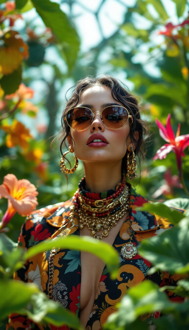 The image should be highly detailed, with a focus on capturing details of the scene. The image should be in 8k resolution, with a sense of hyper-realism and realism. The image should be an unparalleled masterpiece, with a sense of award-winning quality. Photographers like Mario Testino or Steven Meisel, known for their high-fashion work, would excel in capturing this scene. A Canon EOS R5 with a 50mm f/1.2 lens, settings at ISO 100, aperture f/2.8, and a shutter speed of 1/200s to achieve a sharp focus on the model while softly blurring the background. A close-up shot of a model in a vibrant, tropical greenhouse, wearing an eclectic Gucci outfit with bold prints and textures, sunglasses, and chunky jewelry. The lush greenery and exotic flowers create a stunning backdrop, while soft, natural light filters through the glass ceiling, casting dappled shadows on the model’s face, enhancing the luxurious and artistic atmosphere. Captured in a style reminiscent of Mario Testino, using a Canon EOS R5 with a 50mm f/1.2 lens for a highly detailed, photo-realistic composition. The style is high-fashion with a focus on luxury and vibrancy. A close-up composition will highlight the details of the outfit and accessories while capturing the lush background. The theme is "tropical fashion" combining elements of nature with high-end fashion. The model showcases an eclectic Gucci outfit adorned with bold prints and textures, complemented by sunglasses that reflect the greenery around. Chunky jewelry adds a touch of glamour. The greenhouse setting is filled with vibrant flowers and rich, green foliage, creating a striking contrast with the sleek fashion. Soft, natural light filters through the glass ceiling, creating a play of light and shadow that enhances the luxurious feel of the scene. Incorporate soft bokeh effects in the background to emphasize the model and outfit, while the dappled sunlight creates a warm, inviting atmosphere.
