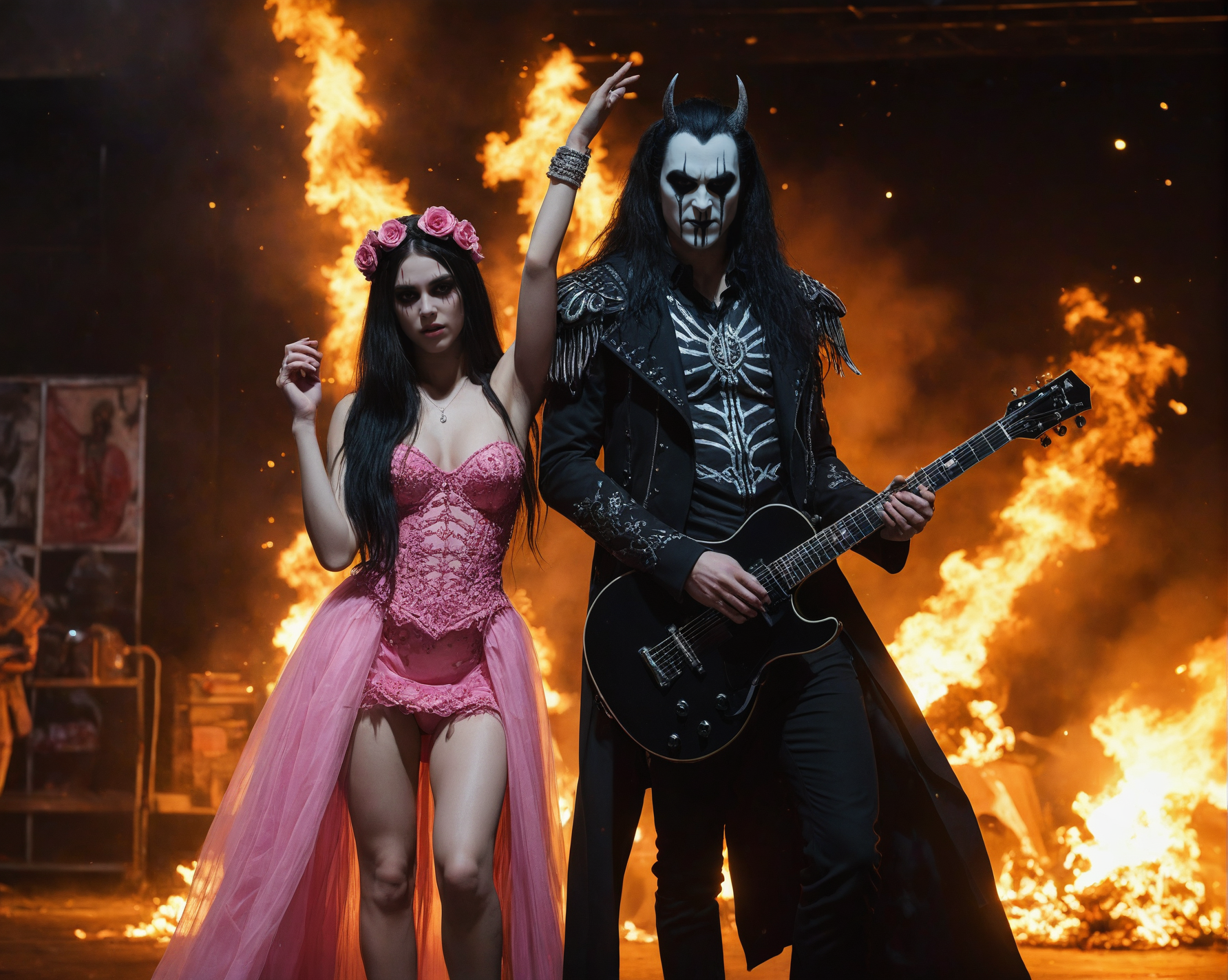 score_9, score_8_up, score_7_up, (full body view:1.3), 2 persons, (1man, heavy metal guitarist, corpse paint, long hair), (1girl, pop singer in pink dress), standing on a stage, flames, explosions, blood, flowers, unicorns, ziprealism, real skin, ray tracing, detail shadow, shot on Fujifilm X-T4,85mm f1.2,sharp focus, <lora:add-detail-xl:1>