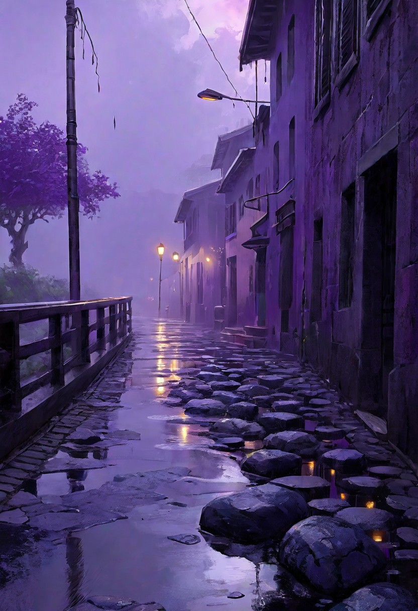 Anime pastel art, low lit art,a pitch purple setting, score_9, score_8_up, score_7_up, source_anime, masterpiece, best quality, very aesthetic, absurdres, art style, A gloomy scene of foothpath in fog and purple light ; ((overcast sky))[1.0], ((drizzling rain))[1.1], ((dim foothpath made with big stones))[1.2], (( reflections in footpath))[1.3], ((melancholic atmosphere))[1.5], ((stylized anime art))[1.6], Ultra 3D, 8k, (((best quality)))[2.0], (((Ultra quality)))[2.1], (((world-class quality)))[2.2], (((Hyper detailed)))[2.3], ((sharp details))[2.4], no blur, (((masterpiece)))[2.5]., (8k uhd:1,4) <lora:add-detail-xl:1> <lora:Dynamic Poses:1>