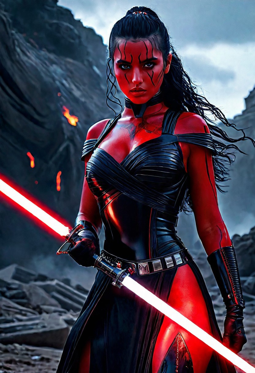 High resolution ultra-realistic of Beautiful Dark Sith girl, 8k, capturing the intensity of the moment, cinematic lighting, standing on a bloody and turbulent battlefield in a bloody battle, wavy black hair, realistic dirty pale face, realistic blue eyes, beautiful hourglass figure, burning in a Star Wars Town, intricately designed cloth dirty black-red robes, Star Wars Aesthetic, perfect athletic figure, beautiful Dark Sith Knightess, ultra realistic, cinematic style, vigorous and seductive, athletic figure, Star Wars style, dramatic lighting, wet and sweaty skin, dirty skin, athletic figure, dark fantasy, dramatic lighting, Greg Rutkowski style, Dark Sith Knightess on in Jedi dress, hyper-detailed, hyper-realistic, natural light, extremely intricate details, masterpiece, epic, bright colours, Attractive 21 old years girl, Attractive, beautiful firm Breasts, sharp focus, digital painting, Photograph Taken on Nikon D750, Alphonse Mucha, 8K, athletic figure, Hyperdetailed, hyperrealism, Attractive, Attractive bust girl, asymmetric balance