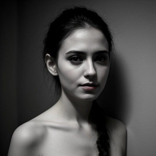 one side lighting, ((pitch black background)), ((greyscale)), studio set, perfect drawn face, very beautiful intensive eyes, wearing only a very classical oldschool nightdress, she performs an expression dance in style from Pina Bausch with whole body effort, on a lonely theater stage, stunning sensual´woman in her end 40s, simply accenting the natural beauty, absolute minimal makeup, single braid black hair, filmed with arri one stage camera, sad melancholic look,