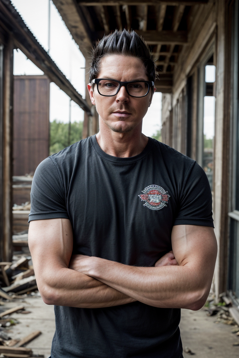 ga_zakbag, male, black hair, thick rimmed glasses, muscular, arms crossed, looking at viewer, from front, serious expression, arm tattoos (dusk, abandoned building, eerie, darkness:1.1), professional photograph taken with a Canon EF 85mm F/1.8 USM