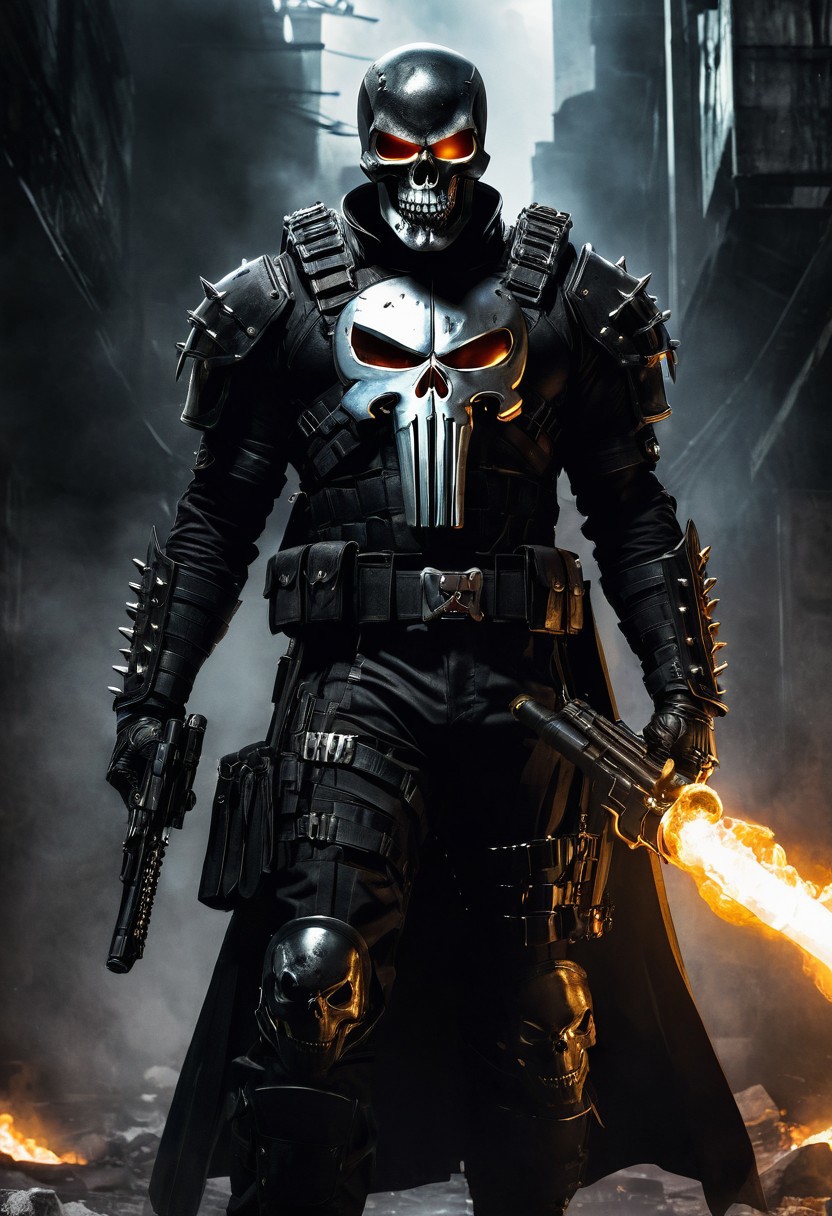 Expressionism - Cinematic superhero concept art. A towering, intimidating figure clad in black, militarized armor with a twisted, skull-like mask and piercing, ethereal eyes that glow with an otherworldly intensity. The figure is encircled by a blazing, circular chain that crackles with fiery energy, casting a warm, golden glow on the dark, metallic armor. Spikes and tactical gear adorn the outfit, with a striking, silver skull emblem emblazoned on the chest, reminiscent of the Punisher's iconic symbol. Inspired by the dark, gritty style of comic book artists like Frank Miller and Greg Capullo, with the dramatic lighting and intense atmosphere of a Tim Bradstreet illustration, the scene pulses with a sense of foreboding power and supernatural energy.