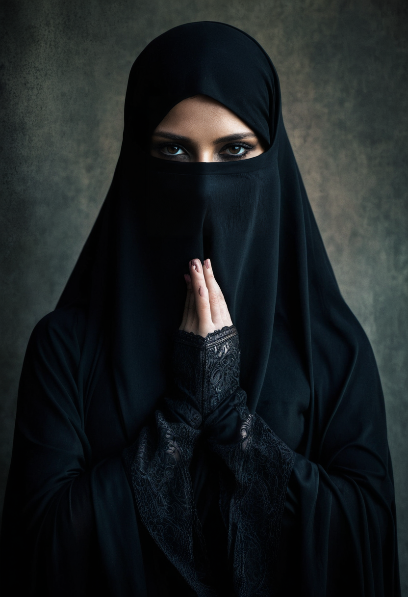 Dark Fantasy Art of a woman in a black burqa covering her face burqa style, dark, moody, dark fantasy style,