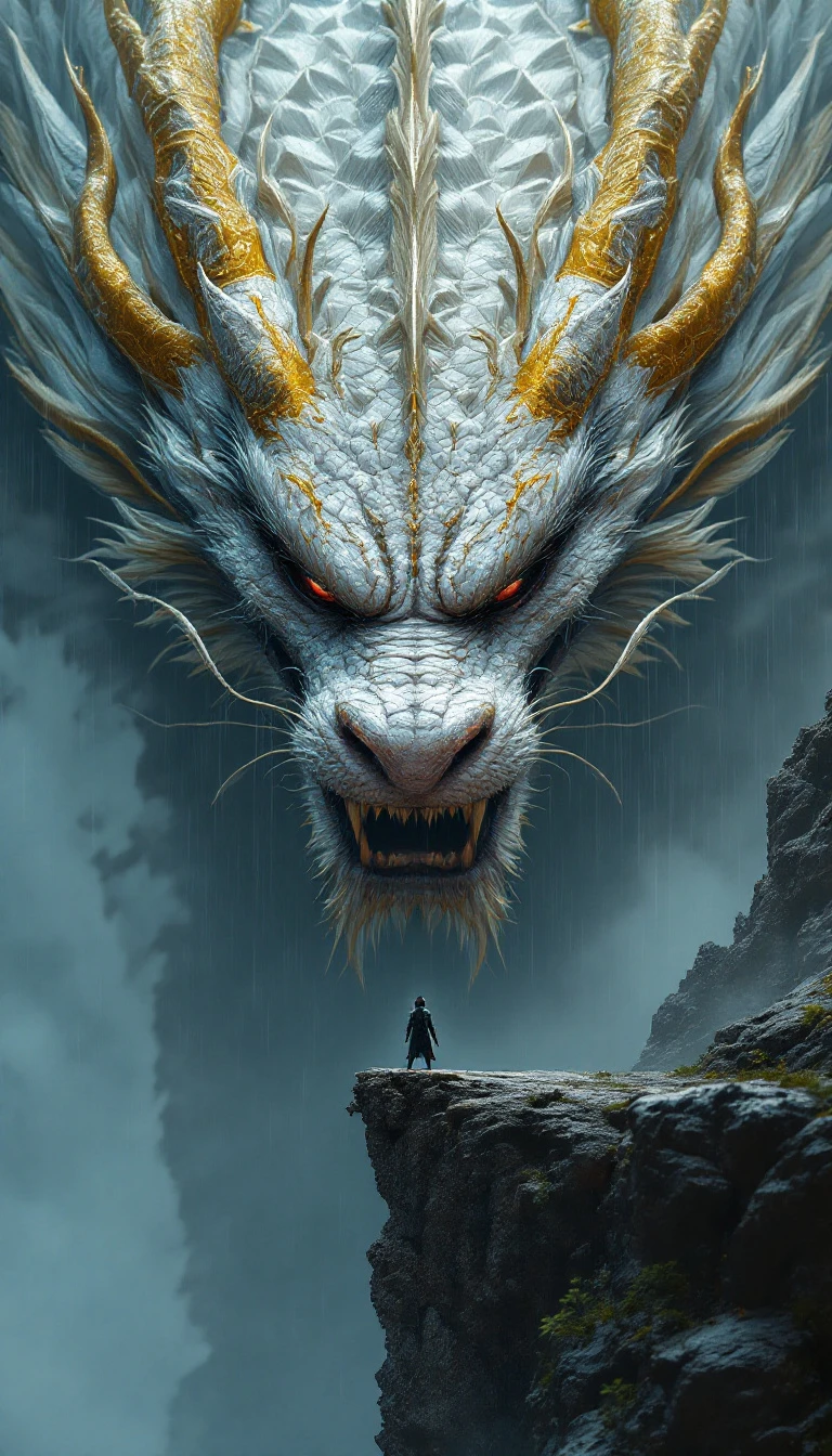Hyper-detailed, ultra high quality CGI, masterpiece, fine art, VFX fine art, extreme contrast, detailed painting, digital illustration. A high-end 3D rendering software like Unreal Engine 5, utilizing ultra-high-quality CGI techniques to achieve crystal-clear visuals and extreme contrast. Create a hyper-detailed front-facing close-up portrait of a rough colossal white and gold angry Chinese dragon, looking at a single silhouette of a knight on a cliff's edge. The scene should feature heavy rainfall and stormy skies, with rocky scales and thick misty surroundings. Use dramatic lighting to highlight the dragon's features and the knight's silhouette, resulting in a masterpiece of hyper-detailed fantasy art.