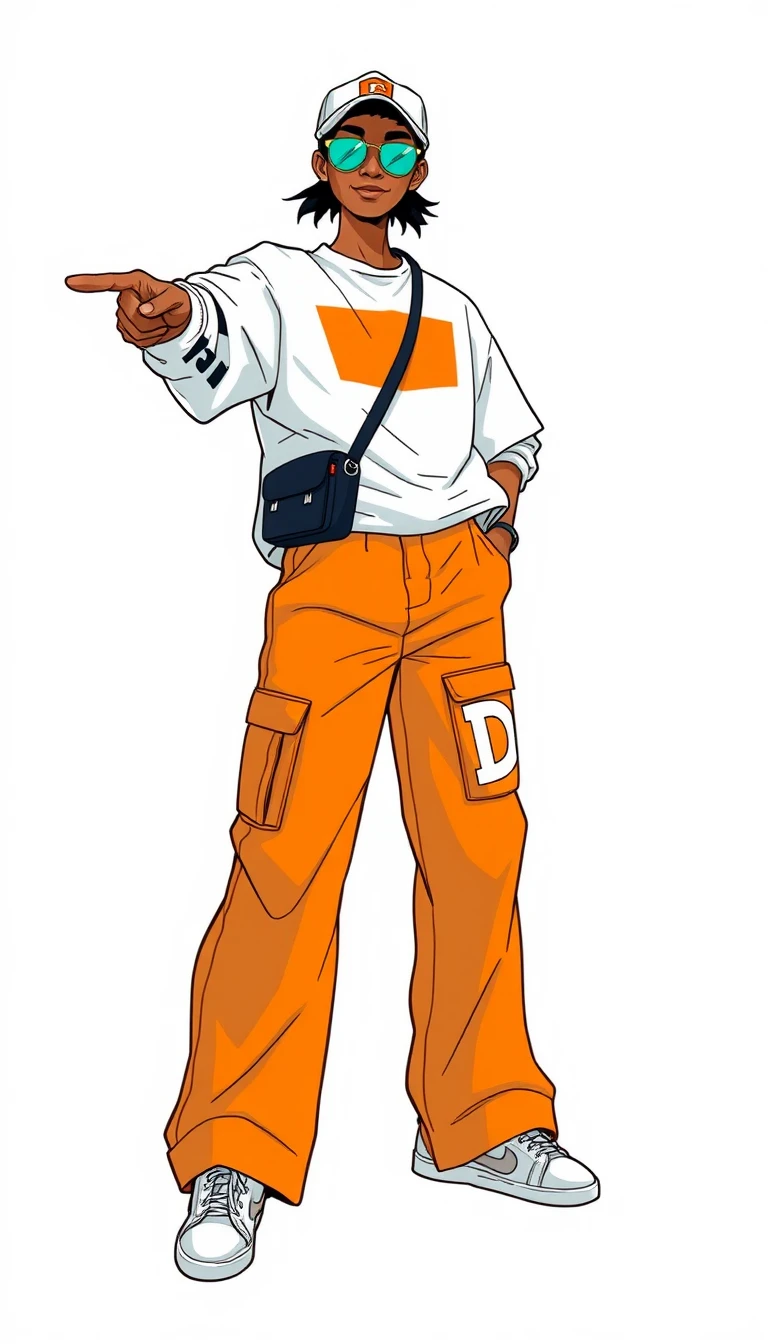 Highly detailed, vibrant composition, dynamic illustration, unparalleled masterpiece. Digital illustration tools such as a Wacom tablet with software like Adobe Illustrator or Procreate, utilizing vector graphics for clean lines and vibrant colors. Illustrators like Malika Favre, known for her bold use of color and minimalistic style, and Jean Jullien for his playful and expressive character designs. The image depicts a stylized illustration of a person standing confidently with one arm extended, pointing forward. The individual is dressed in a modern, casual outfit featuring a white oversized top with an orange graphic, paired with wide-legged orange pants that have a white patch with the letter "D" on them. They are accessorized with a white cap, teal sunglasses, and a small black crossbody bag. The person's pose and expression exude a sense of determination and direction. The background is a plain, light color, which helps to emphasize the vibrant colors and bold lines of the subject's attire and stance.