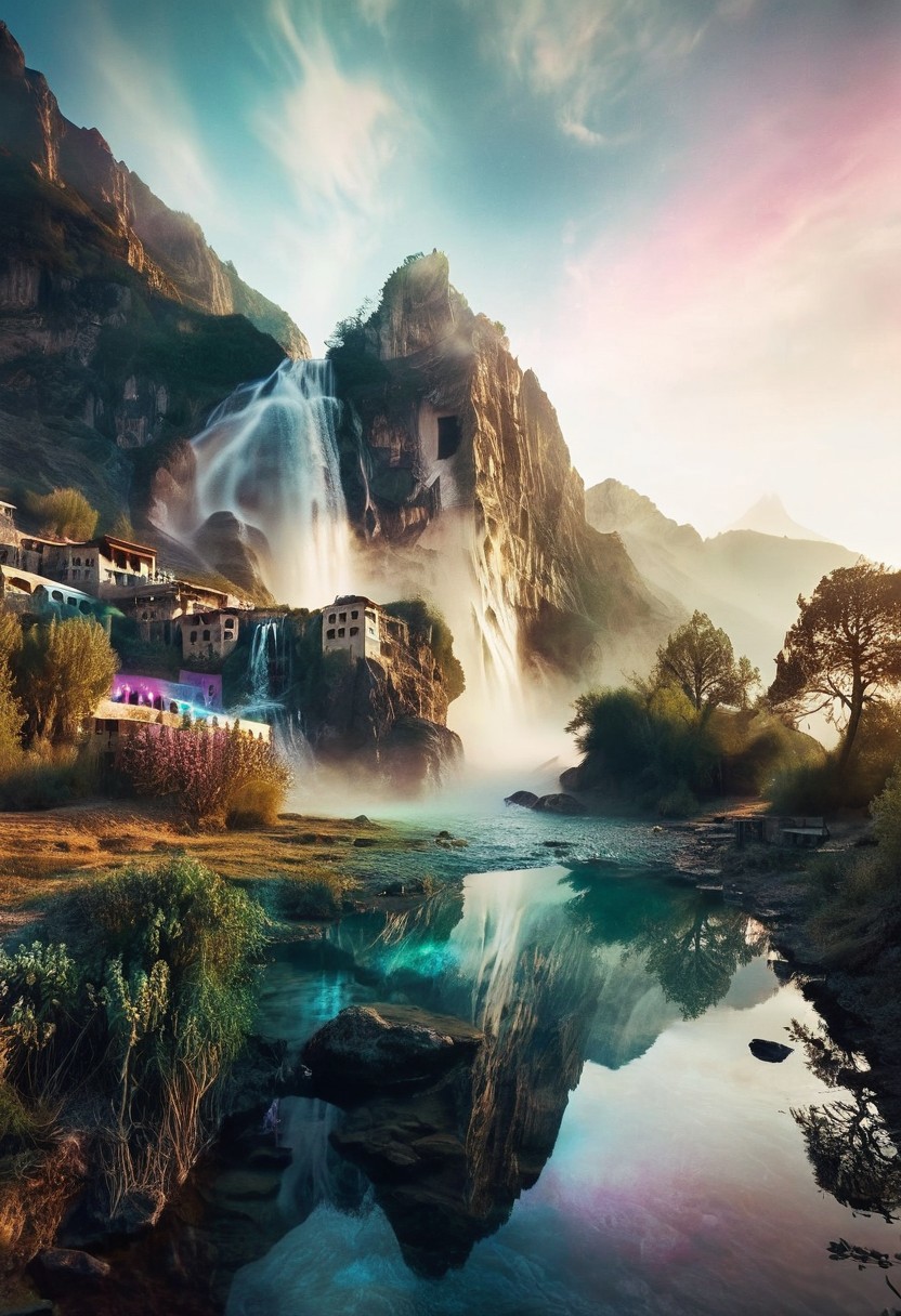 (by Ellen Jewett:1.5), (Bioluminescent Impressionism, Egyptian landscape, The Dreamland,, their peaks veiled in mist. mixed media, surrealism, great lighting, A surreal landscape highly detailed . extremely high-resolution details, appears trapped in an optical illusion of reflections and refractions colorful , mountains and village in Turkey, professional photography, natural lighting, volumetric lighting maximalist. intricately detailed, complex, elegant, expansive, fantastical, waterfall, ethereal landscapes, depth of field, biotech emotion:1.3) <lora:xl_more_art-full_v1:0.5> <lora:add-detail-xl:1> <lora:RMSDXL_Creative:2>. GhostlyStyle