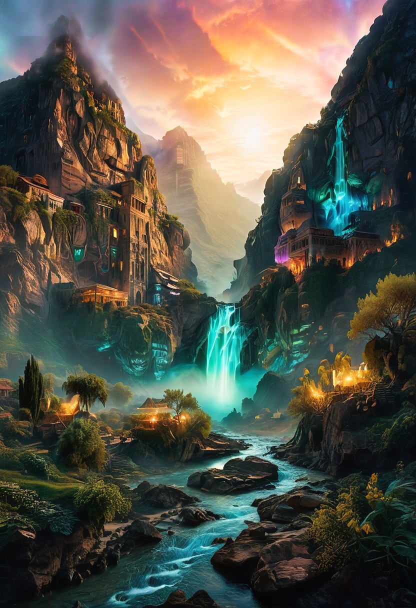 (by Ellen Jewett:1.5), (Bioluminescent Impressionism, Egyptian landscape, The Dreamland,, their peaks veiled in mist. mixed media, surrealism, great lighting, A surreal landscape highly detailed . extremely high-resolution details, appears trapped in an optical illusion of reflections and refractions colorful , mountains and village in Turkey, professional photography, natural lighting, volumetric lighting maximalist. intricately detailed, complex, elegant, expansive, fantastical, waterfall, ethereal landscapes, depth of field, biotech emotion:1.3) <lora:xl_more_art-full_v1:0.5> <lora:add-detail-xl:1> <lora:RMSDXL_Creative:2>