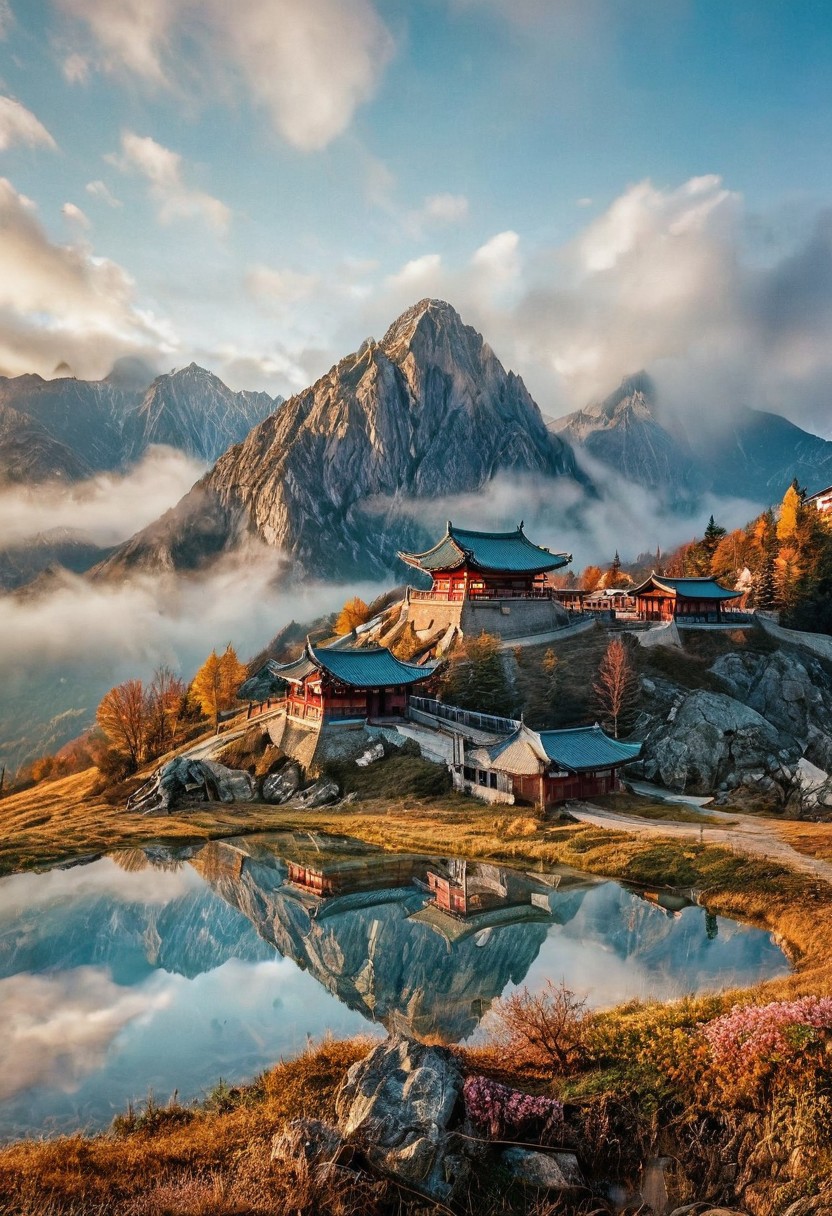 their peaks veiled in mist. mixed media, surrealism, great lighting, A surreal landscape highly detailed . extremely high-resolution details, appears trapped in an optical illusion of reflections and refractions colorful , mountains and Korean village in Korea, professional photography, natural lighting, volumetric lighting maximalist. intricately detailed, complex, elegant, expansive, fantastical, film photography style, medium grain