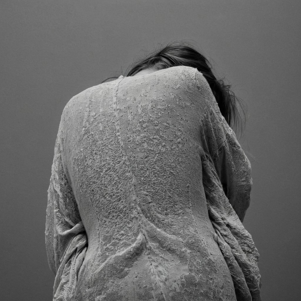 Fine delicate details. Painful numbing grief and sadness as seen from behind. Soft fabrics covering back, gray Background with heavy texture. Stunning lighting