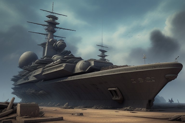 a space pirate battleship among the ruins of an advanced, futuristic city