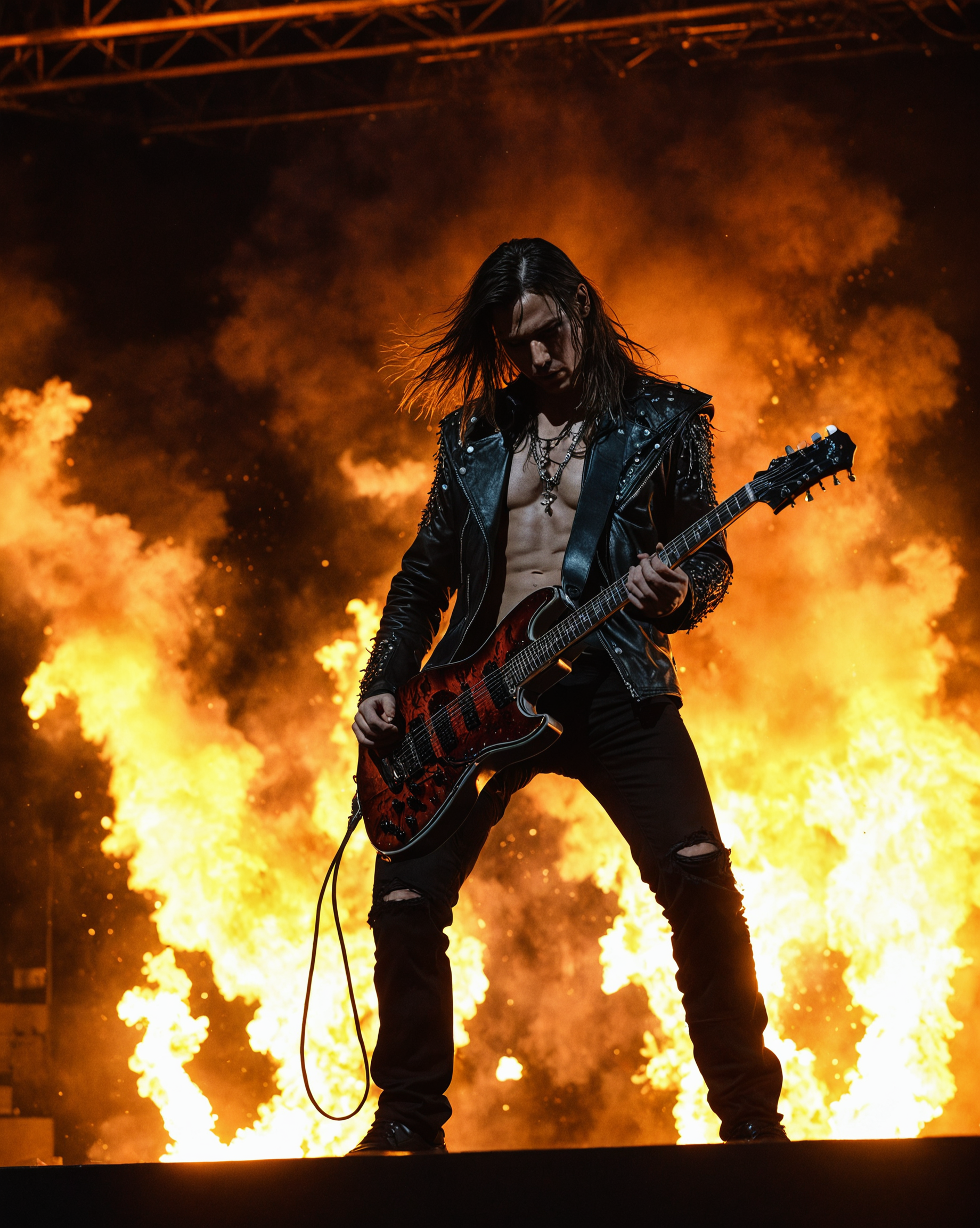 score_9, score_8_up, score_7_up, (full body view:1.3), heavy metal band, long hair, standing on a dark stage, flames, explosions, blood, ziprealism, real skin, ray tracing, detail shadow, shot on Fujifilm X-T4,85mm f1.2,sharp focus,