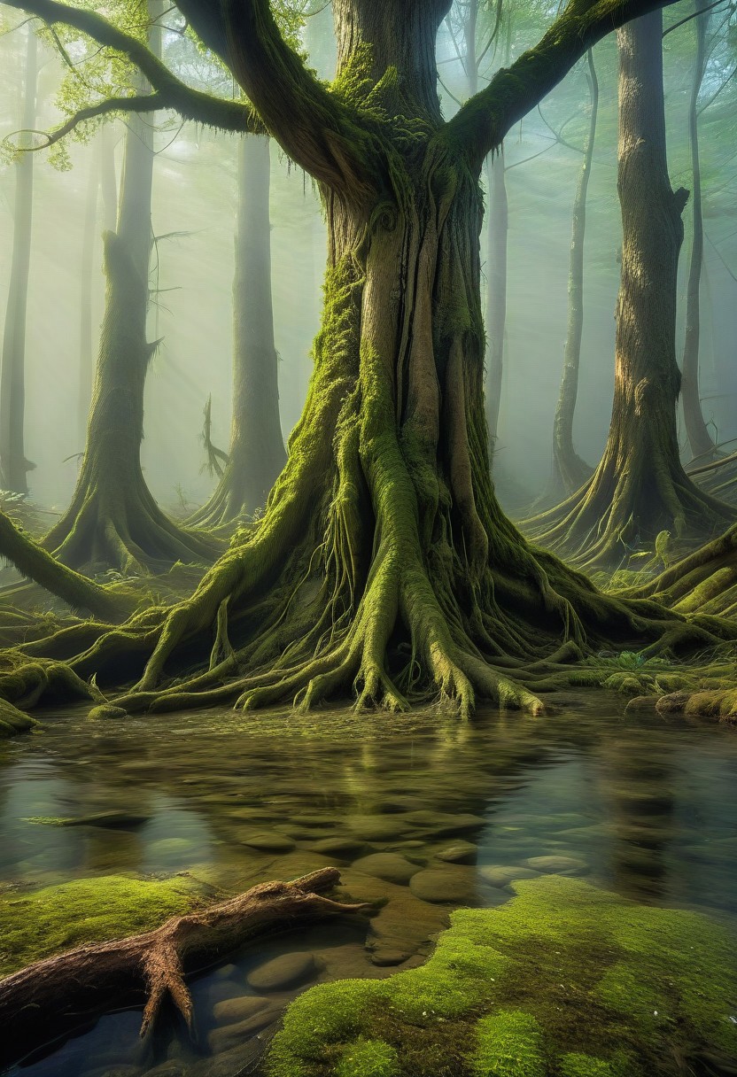 a tiny fresh spring emerges from the mossy ground and the clear water starts gently trickling away in a magical fashion, it flows past gargantuan tree roots,realistic, national geographic photograph, award-winning