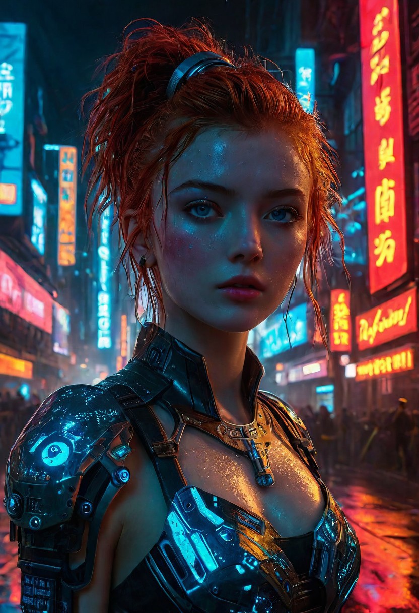 High resolution ultra-realistic of Beautiful Cyberpunk girl, 8k, capturing the intensity of the moment, cinematic lighting, standing on a troubled street in a futuristic city in a bloody battle, wavy red hair, realistic dirty pale face, realistic blue eyes, beautiful hourglass figure, burning in a futuristic city, intricately designed cyberpunk style clothes dirty colorful robes, Cyberpunk 2077 Aesthetic, perfect athletic figure, beautiful Sadie Sink as Cyberpunk girl, ultra realistic, cinematic style, vigorous and seductive, athletic figure, Cyberpunk sci-fi style, dramatic lighting, wet and sweaty skin, dirty pale skin, athletic figure, dark fantasy, dramatic lighting, Greg Rutkowski style, Cyberpunk girl on in cool dress, hyper-detailed, hyper-realistic, natural light, extremely intricate details, masterpiece, epic, bright colours, Attractive 21 old years girl, beautiful firm Breasts, sharp focus, digital painting, Photograph Taken on Nikon D750, Alphonse Mucha, athletic figure, Hyperdetailed, hyperrealism, Attractive, Attractive bust girl, asymmetric balance