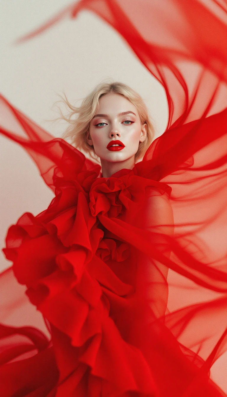 A Canon EOS R5 with a 50mm f/1.2 lens, aperture set to f/1.2 for a shallow depth of field, ISO 100 for clarity, and a shutter speed of 1/200s to capture the movement of the fabric. This image could be inspired by the works of photographers like Tim Walker or fashion photographers like Mario Testino, known for their high fashion and artistic compositions. A female subject adorned in a flowing, ruffled red dress. She appears poised and detached, with a serene expression on her face, augmented by red lipstick that matches the tone of her attire. Her skin is pale against the vibrant ruffle accents of her outfit. A striking, diaphanous red fabric surrounds her, creating a dynamic and visually captivating composition that blurs parts of her figure, lending an almost painterly quality to the photograph. Her hair is light and neatly styled, enhancing the ethereal and refined atmosphere of the image. The background is pale and subtly textured, ensuring that the focus remains on the subject and her dramatic ensemble. This image exudes a sense of high fashion and abstract artistry, emphasized through color harmony and fabric movement.
