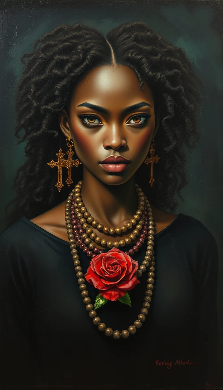 renaissance style painting, oil paints, impasto, cracked paint, Style of Shinji Aramaki, Style of Artgerm, Style of Chris Bachalo, Style of Anne Bachelier, Style of Ralph Bakshi, Dungeons & Dragons, she has dark skin and is of sub-saharan African descent, her hair long hair is 4c textured curls, her hair is dark brown in color, her eyes are dark brown in color, she has dark brown lipstick, her earrings have large gold crosses dangling down, she wears three layers of beaded necklaces around her neck, each necklace layer is larger than the one under it, the largest layer has a red enamal rose as the centerpiece, she wears a long black dress with long sleaves, it is dark outside, she looks at the viewer with distrust in her eyes,