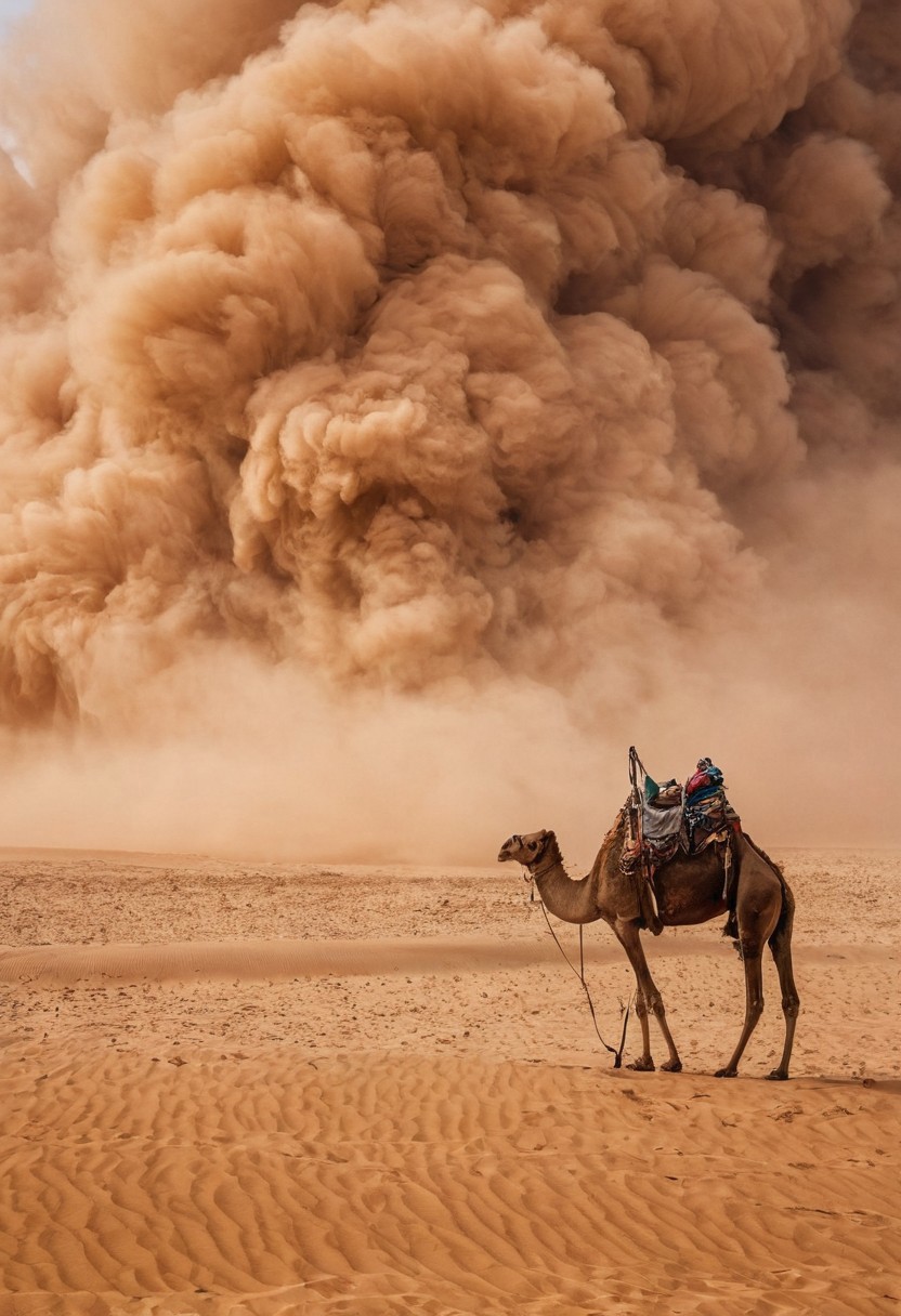 scenic view of a sand storm in the Sahara desert, a camel in the middle of it. (Use Dream Diffusion Secret Prompt). vibrant, award-winning, professional, highly detailed