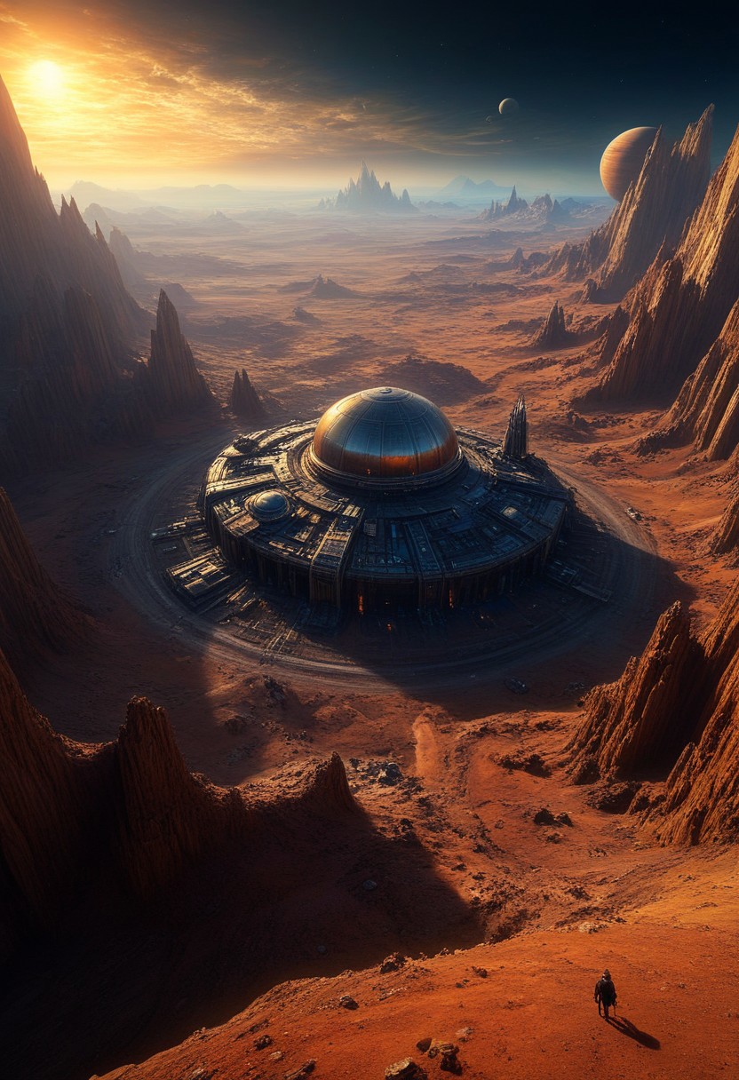 beautiful landscape, 64k, UHD, ((masterpiece, ultimate quality)), sharp focus, beautiful scenery, highres, highly detailed, photo, realistic, photorealistic, best_of George Lucas art style (a deserted planet (on the bottom right (dome like houses))(on the top left (one giant planets))) cinematic, artistic, highly intricate details, masterpiece, best quality, 8k, UHD