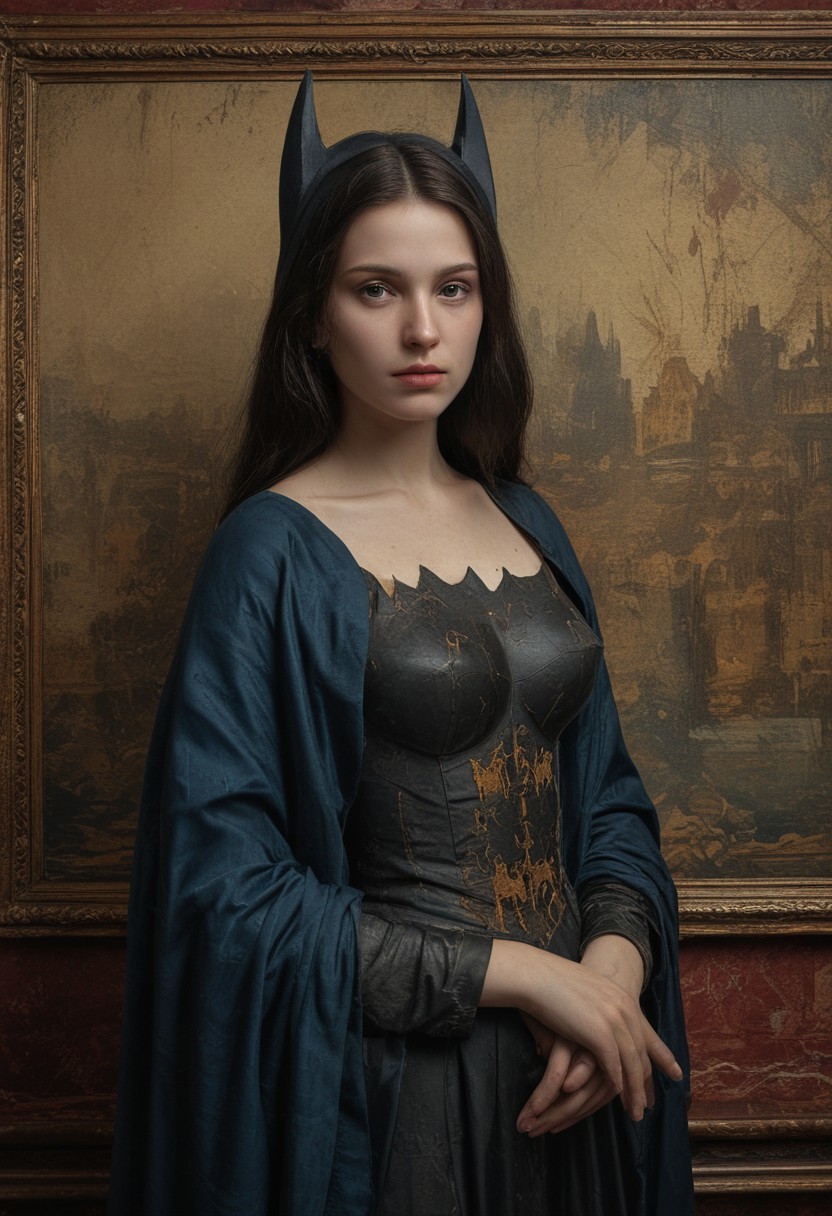 BATMAN as Mona Lisa photographic recreation of the famous painting, detailed matte painting, deep color, fantastical, intricate detail, splash screen, complementary colors, fantasy concept art