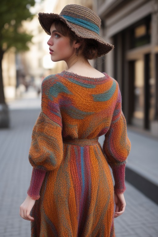 medium closeup <lora:twisted_torso_v0.1:1> twisted torso, looking at viewer, looking back, vintage color 1905 photograph, beautiful woman on sidewalk, long neck, long legs, wearing a Fortuny dress, hat, hair in bun, (big breasts:1.2) <lora:ClothingAdjuster3:0.2> from behind, vivid colors <lora:fortuny:0.8>