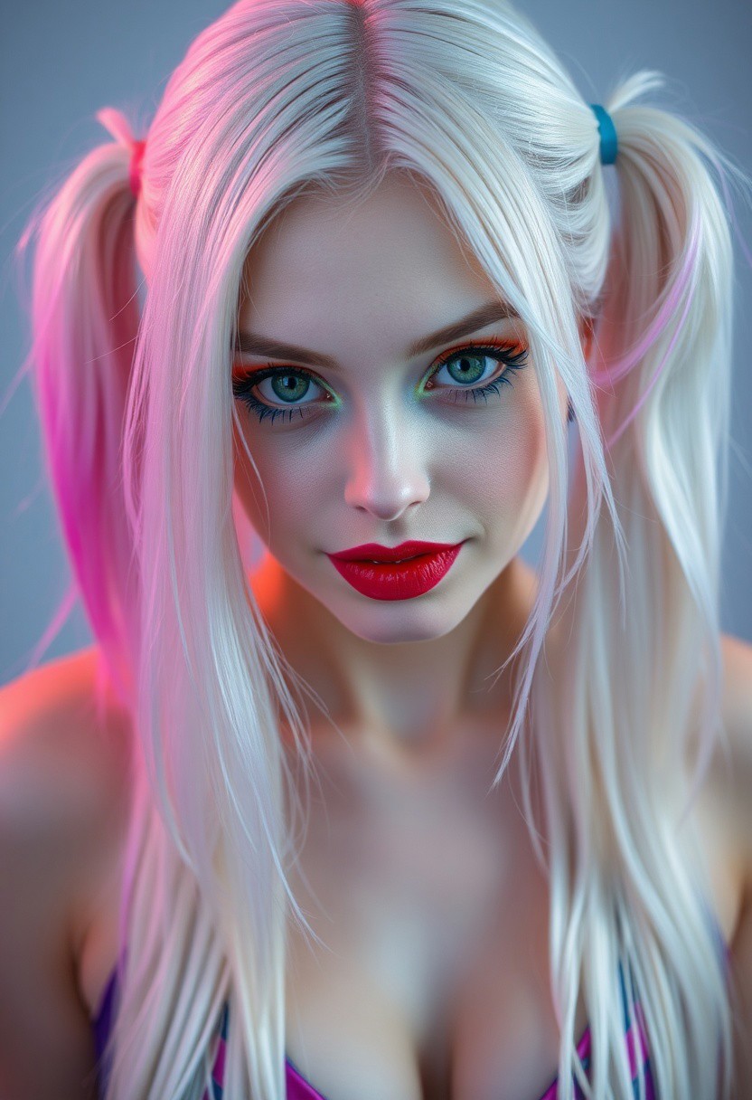 a gorgeous 20 years old caucasian woman, very pale skin, platinum blond very long hair in unkempt very long pigtails on her each head's sides in different color of cyan and pink, long red eyelashes on her left eye and long blue eyelashes on her right eye, blue mascara on her right eye and red mascara on her left eye, purple eyeliner define her big beautiful amber eyes, green glittering eyeshadow on her right eyelid and orange glittering eyeshadow on her left eyelid, luscious sensual red glossy lips, rouge, sexy curves, big breasts, sexy feminine latex dress with cleavage in cyan-pink pattern, looking at viewer naughty and playfully, seductive smirk
