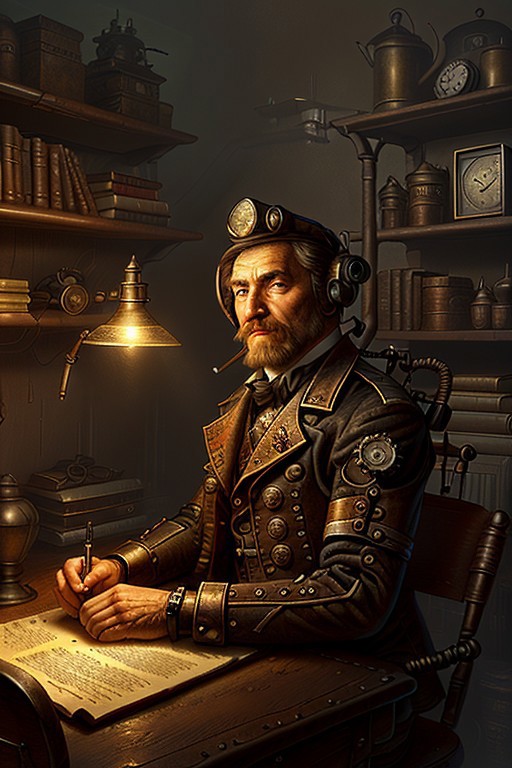 score_9, score_8_up, score_7_up Portrait of a young handsome male steampunk detective sitting at a cluttered desk, focusing on his intense expression. He has a focused look, and wears a dark Victorian coat. The lighting is warm from a single flickering oil lamp on the desk, casting shadows across his face. The background is blurred, with only hints of gears and bookshelves. The scene is richly detailed in sepia tones, creating a mysterious, close-up, waist-up composition
