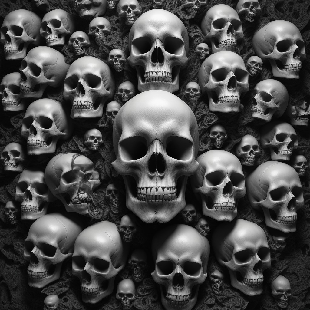 A captivating depiction of a dreamlike conceptual artwork featuring a vivid and intricate depiction of multiple skulls black and white and men faces. Each face shows great shock and awe, creating a psychedelic and otherworldly atmosphere. Each face with its expression, adding depth and complexity to the composition. The overall effect is a conceptually and visually stunning representation of the animal emotional spectrum. 3D rendering, vibrant concept art.