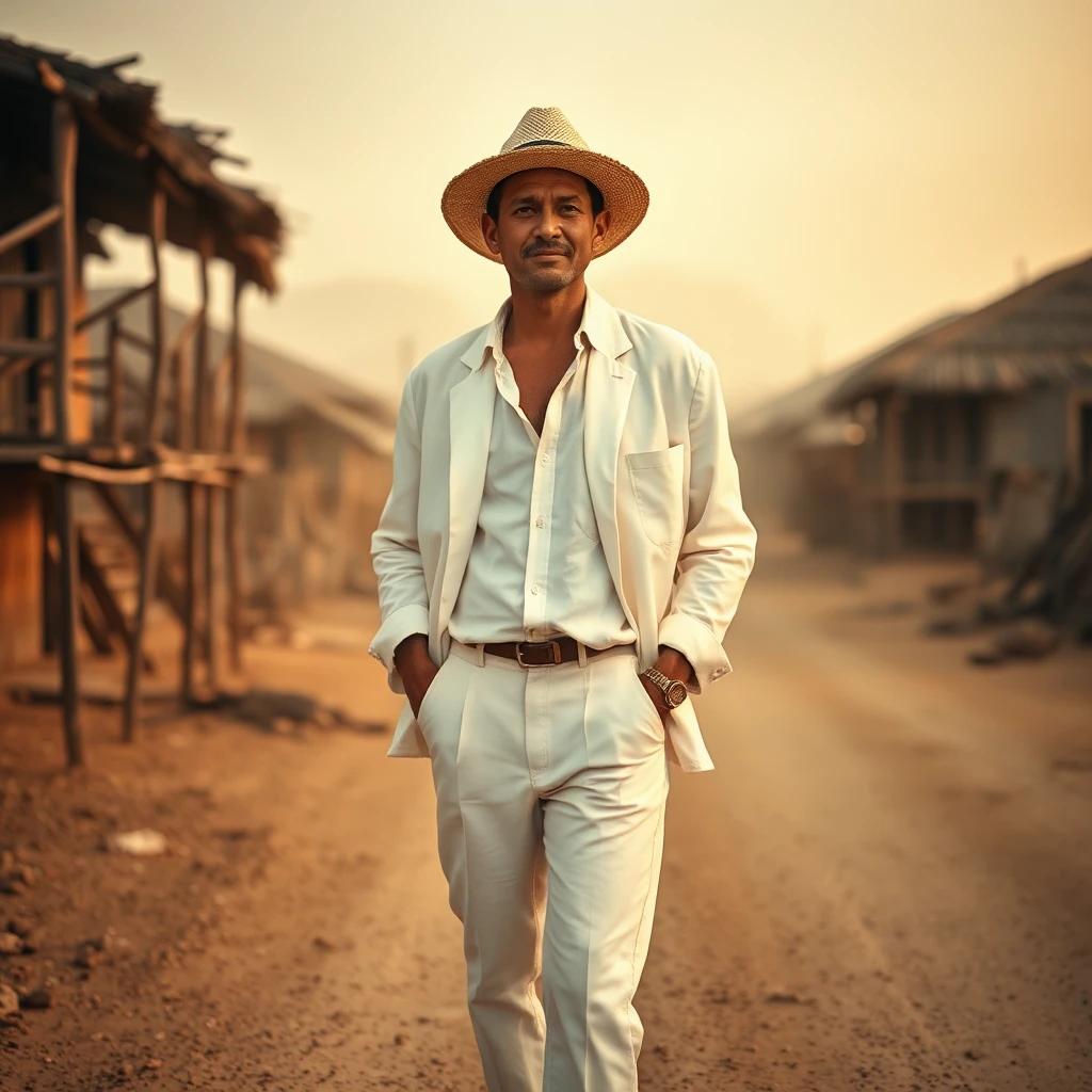 An enigmatic, timeless man around 40 years old, with tan skin, with a slight smile on his lips and a deep, sad gaze with light eyes. He wears an impeccably white outfit, including a shirt, jacket, pants, straw hat, and white espadrilles. His appearance stands out for its cleanliness, contrasting with the dusty, dry, and desert-like environment. He has a relaxed demeanor, standing with one hand in his pocket and gazing towards the horizon. In the background, there is a small rural town on the Atlantic coast of Colombia, with tall wooden stilt houses (palafitos) that have thatched straw roofs, and no automobiles are present. The environment includes a dry and dusty road with sparse vegetation. The atmosphere is hot and dry, with dust floating in the warm afternoon light, between 2 and 3 PM, enveloping the scene with visible particles around the character, creating an authentic, cinematic feel. His figure is slightly off-center, allowing the rustic, stilted houses of the town in the background to contrast with his figure. The lighting is warm and dramatic, casting subtle shadows on his face and white clothing that intensify his expression’s depth and tone. Photographic realism with a cinematic style, emphasizing the ambiance and texture.