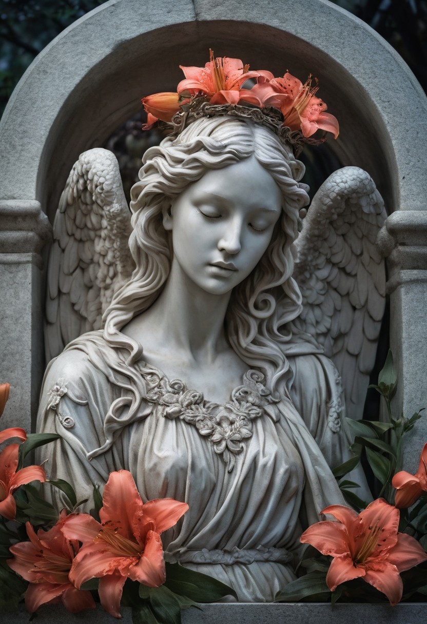 Angel statue, sorrowful expression, nestled among lilies on grave, filigree head bow, cloudy ambiance, vibrant flowers, symmetrical balance, chiaroscuro, natural and fantastical motifs, surreal charm, intricate detailing, elegance, emotional depth, visual harmony, underwater realm, full moon ethereal glow, starry reflections on silken mane, coat adorned with coral-red blooms, [prompt from ai artist Voisard]