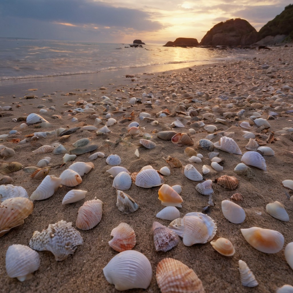 Beach with sunset, phosphorescent rocks powered by light or solar energy, seashells, high definition