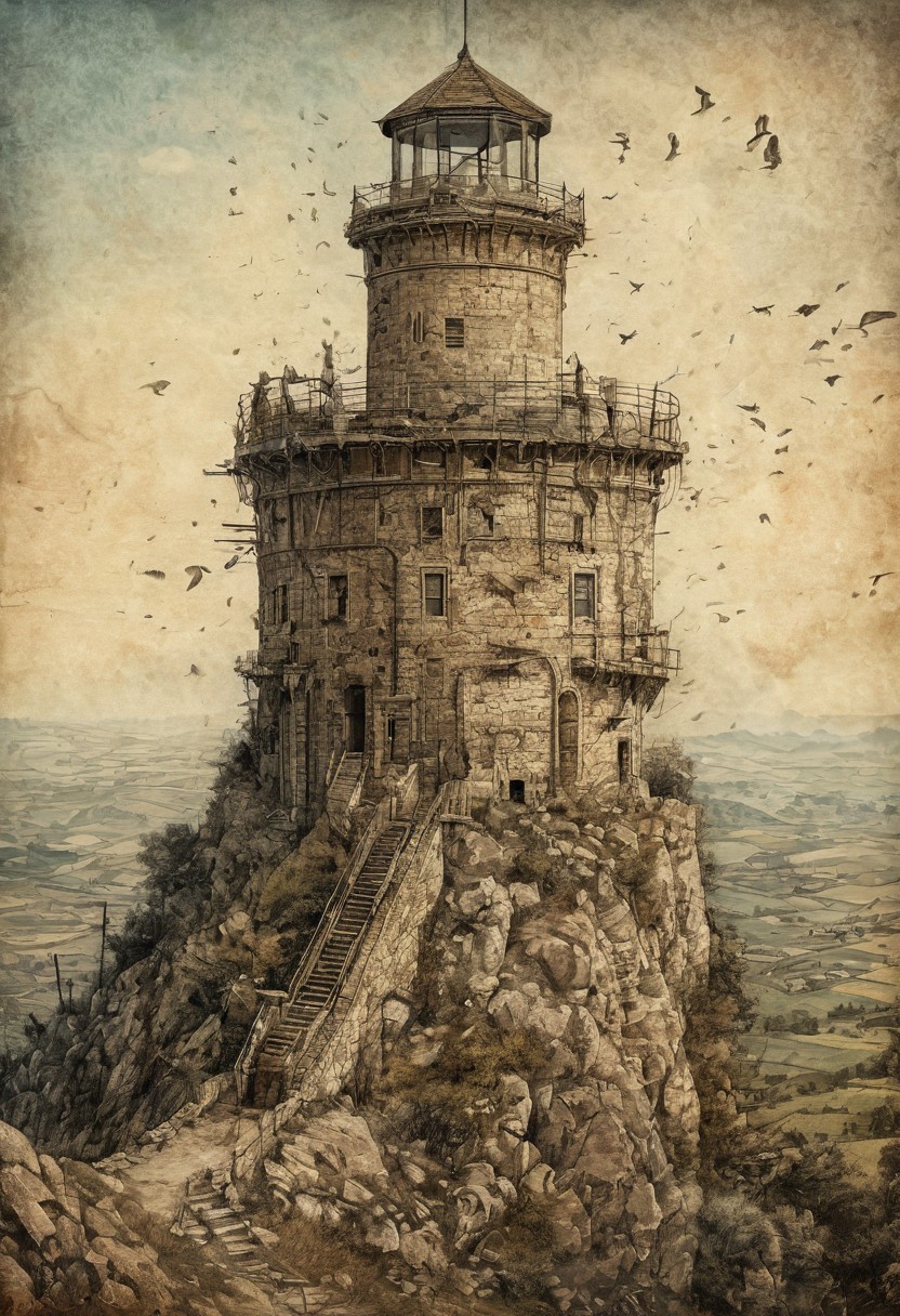 Epic high conceptual digital illustration, hyper realistic intricate artwork, creation of an image that is showcasing grand landscapes with historic watchtowers, emphasizing the guardianship over time, sharp focus, vintage atmospheric ambience, art on old paper, Oli and ink on canvas, dedicated watercolor, masterpiece painting, pen and pencil, deep sharpness, intricate detailing, award winning portrait by Kingshuk's craziness