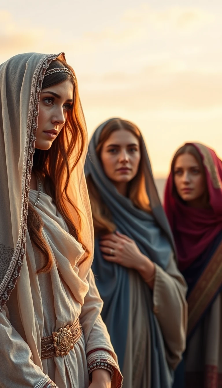 "Create an image set in the old Middle East region, portraying three of the most beautiful women in the Bible in a serene and illuminated scene. On the left, Sara, Abraham's wife, is a beautiful, realistic woman of noble elegance, with long hair and Waiting, partially covered by a thin veil. She wears delicate robes in neutral tones, with ornate details that reflect her position as a Matriarch. She wears clothes in shades of blue and gray, with a touch of pastoral simplicity, indicating her origin as a shepherd. The shoulders. She wears a tunic of rich tones, such as wine and gold, reflecting the luxury of her life with King David. in the background, under the soft sky of the late afternoon. "