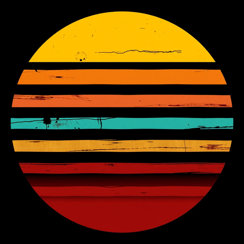 a circular shape filled with distressed horizontal stripes in warm, earthy colors. The stripes transition from deep red at the bottom, through shades of orange, yellow, tan, aqua and green, giving a vintage, sunset-like appearance. Each stripe has a slightly distressed, weathered texture, adding a rustic and retro feel. The simple yet striking pattern evokes a classic retro aesthetic, reminiscent of 1970s designs. Set against a black background, the colors and distressed details of the circle are accentuated, creating a bold and nostalgic visual.