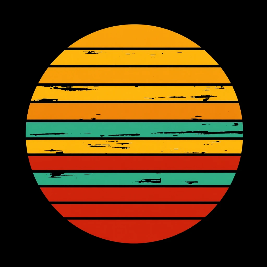 a circular shape filled with distressed horizontal stripes in warm, earthy colors. The stripes transition from deep red at the bottom, through shades of orange, yellow, tan, aqua and green, giving a vintage, sunset-like appearance. Each stripe has a slightly distressed, weathered texture, adding a rustic and retro feel. The simple yet striking pattern evokes a classic retro aesthetic, reminiscent of 1970s designs. Set against a black background, the colors and distressed details of the circle are accentuated, creating a bold and nostalgic visual, vector