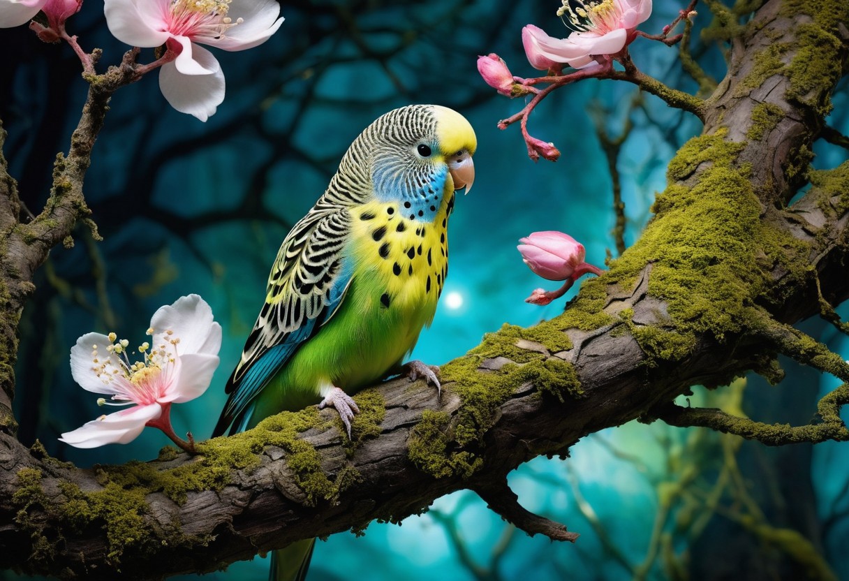 In a mystical forest, a budgie adorned with delicate blooms perches on a gnarled branch. Goblins flit about, their mischievous eyes reflecting an otherworldly glow. The dramatic lighting captures this magical tableau, where nature and magic intertwine