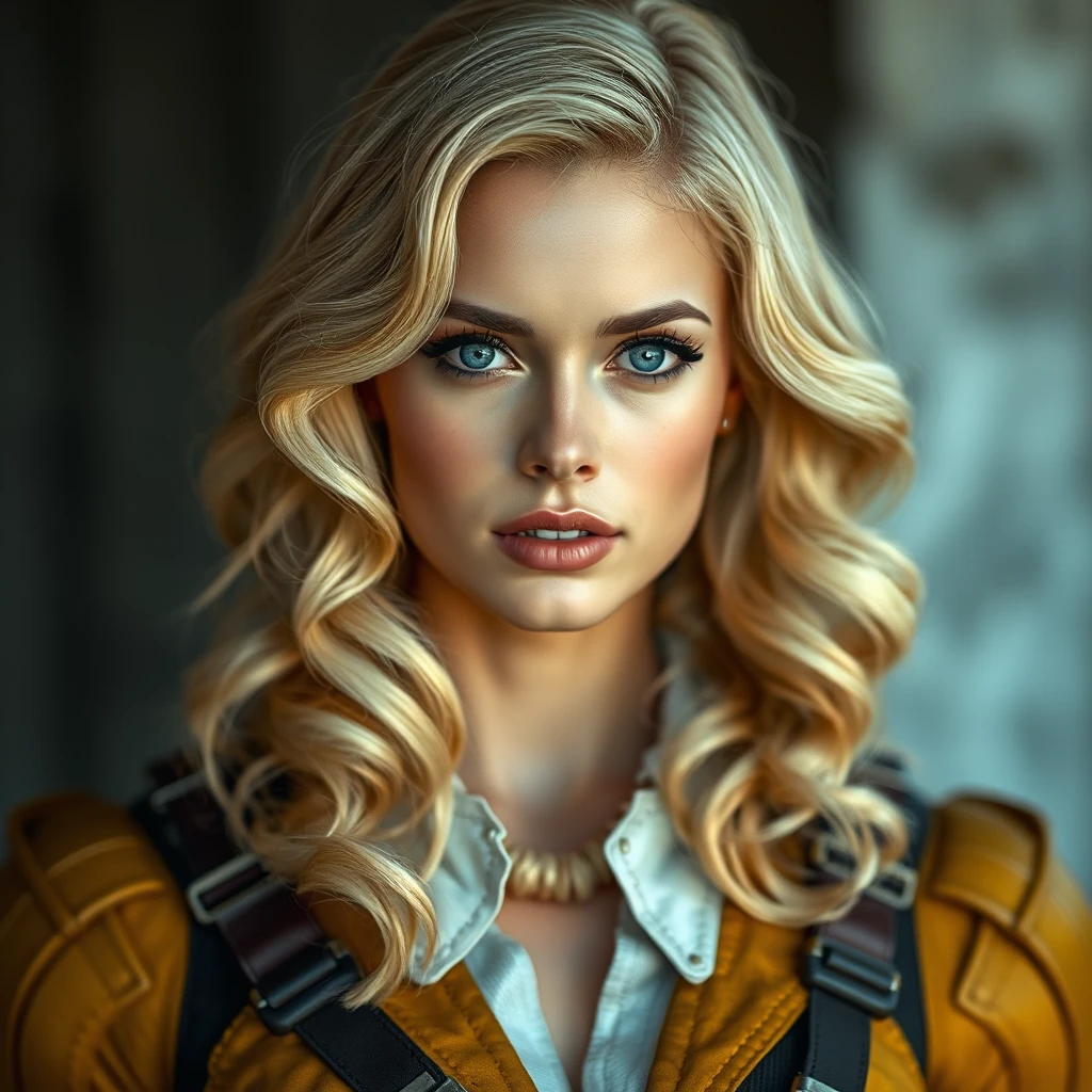 Realistic photo of beautiful woman with blonde wavy shoulder length hair and blue eyes, dressed as Judge Dredd from the comic 2000ad and the movie. Judge Anderson.