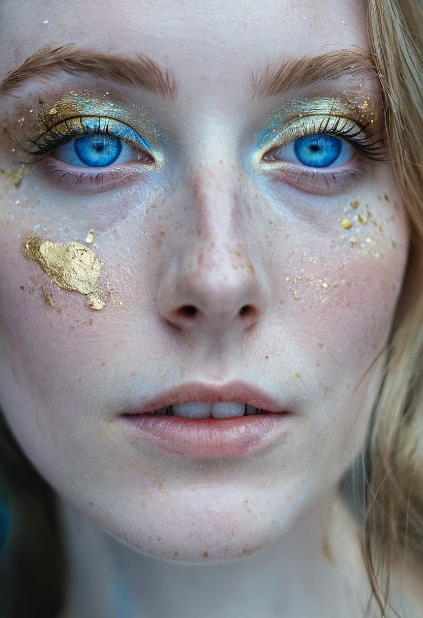 Close-up photography of a woman with blue eyes and expressive gaze, splashes of silver and gold pigments on her face. Pale skin with a few freckles. Background is slightly blurred, ethereal and enchanting atmosphere.