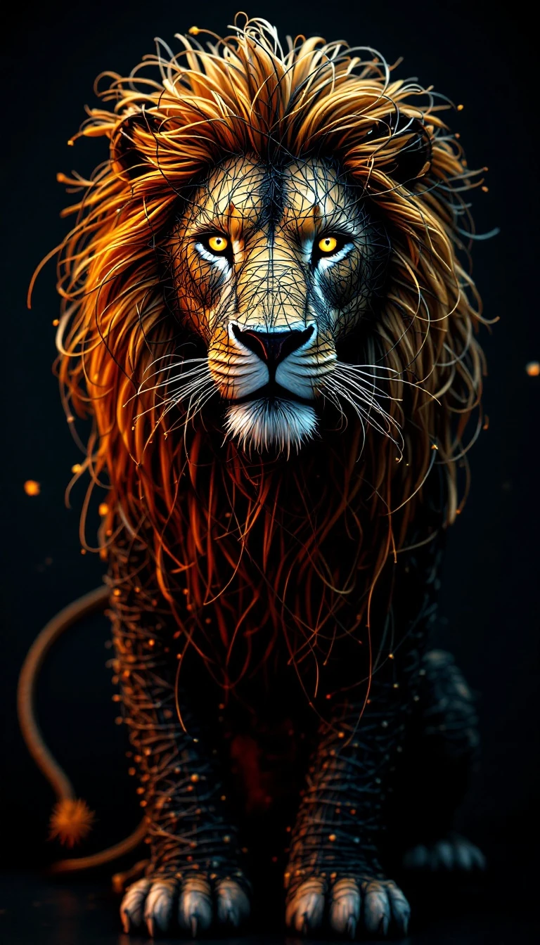 A highly complex abstract sculpture a majestic lion made entirely of loose thin black string. The wild lion is large in a powerful pose staring at the viewer. It's long body twists around the composition. The wrapping of the string should feel loose and flowing. The wild lion is powerful and is charging at the viewer. Bend and twist the string into an elaborate 3D sculpture, using loose gestural flowing shapes. Use multiple levels of the string to create fine detail in the sculpture of the wild lion. Dynamic lighting to create mood and atmosphere. High contrast, fine art, minimalism, gestural, life drawing, experimental. Dynamic, flow. Cinematic. Depth of field.