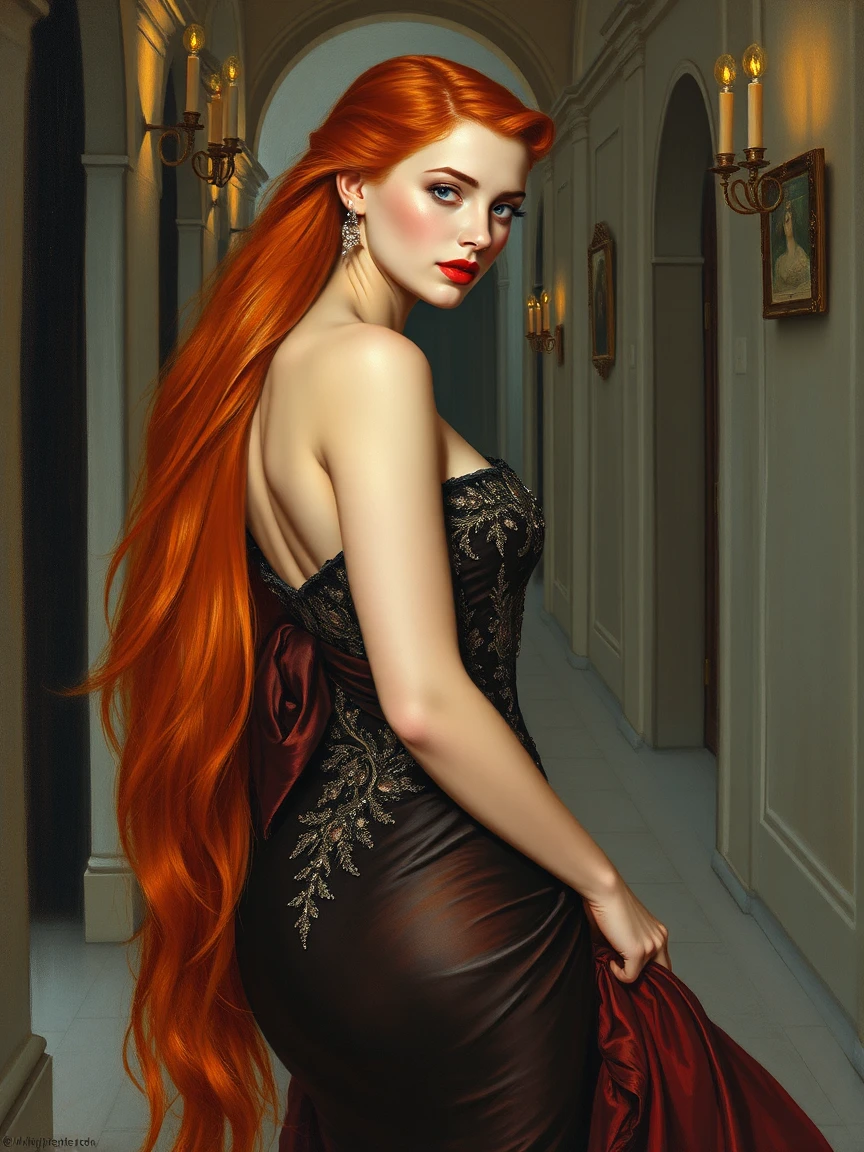 Style of Mark Arian, a beautiful woman, Style of Sandro Botticelli, a stunning woman, Style of Gaston Bussiere, the woman has a slim figure, Style of Paul Cadmus, she has a tiny waist, Style of Pierre Puvis de Chavannes, she has a toned tummy, Style of Luis Royo, her figure is a lot like Twiggy, Style of Frank Cho, classic elegance of a 1950s diva, Style of Pino Daeni, pale skin, Style of Evelyn De Morgan, she has extremely long and extremely straight bright red hair with a middle part, Style of Gil Elvgren, her hair is parted down the middle, Style of Roberto Ferri, her hair is sleek and straight, Style of Artemisia Gentileschi, her eyes are bright blue, Style of Edwin Georgi, she is wearing a stunning 1950s evening gown with intricate detailing complemented by glamorous accessories, Style of Daniel F. Gerhartz, the dress is fitted at the waist which highlights her silhouette in a shape reminiscent of Hollywood glamour, Style of Nan Goldin, she is walking down a 1950s-style red carpet, Style of Milo Manara, classic red velvet ropes, Style of William Mortensen, elegant signage, Style of Alfons Mucha, radiant expression and confident pose, Style of Parmigianino, wide shot of the red carpet and crowd, Style of Francis Picabia, electric mood, Style of Peter Paul Rubens, glamorous, Style of Apollonia Saintclair, evoking the timeless allure of Hollywood's Golden Age, Style of Raffaello Sanzio da Urbino, lighting highlights her soft makeup and radiant skin, Style of Carlos Schwabe, awe inspiring, Style of Guillaume Seignac, good anatomy, Style of Henryk Siemiradzki, stunning visuals, Style of Boris Vallejo, insane details, Style of Alberto Vargas, intricate details, Style of John William Waterhouse, raytracing, Style of William Zorach, Style of Bunny Yeager, Style of George Frederic Watts,