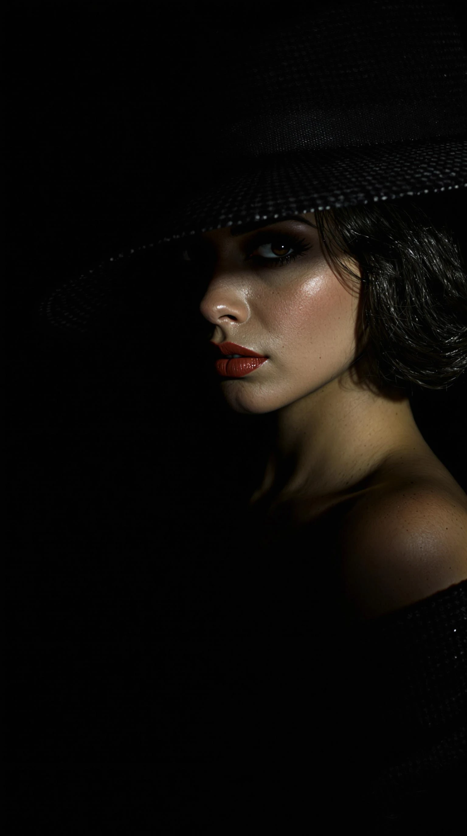 Highly detailed, photo-realistic techniques, unparalleled masterpiece. Capture this image using a Leica M10 with a 50mm f/1.4 lens, set at f/2.8 for a shallow depth of field, ISO 400, and a shutter speed of 1/60s to effectively utilize the dramatic lighting. A noir-style portrait of a woman wearing a wide-brimmed hat, capturing the essence of mystery and intrigue. The shadows should cast dramatically over her face, enhancing the enigmatic atmosphere typical of classic film noir. The figure should possess a piercing gaze and a confident posture, embodying strength and allure. The background should be dark and moody, with subtle highlights that accentuate her features. Utilize dramatic lighting to create stark contrasts, emphasizing the contours of the woman's face and the elegant lines of her hat. The overall composition should evoke a sense of suspense and allure, drawing the viewer into the narrative of the image.