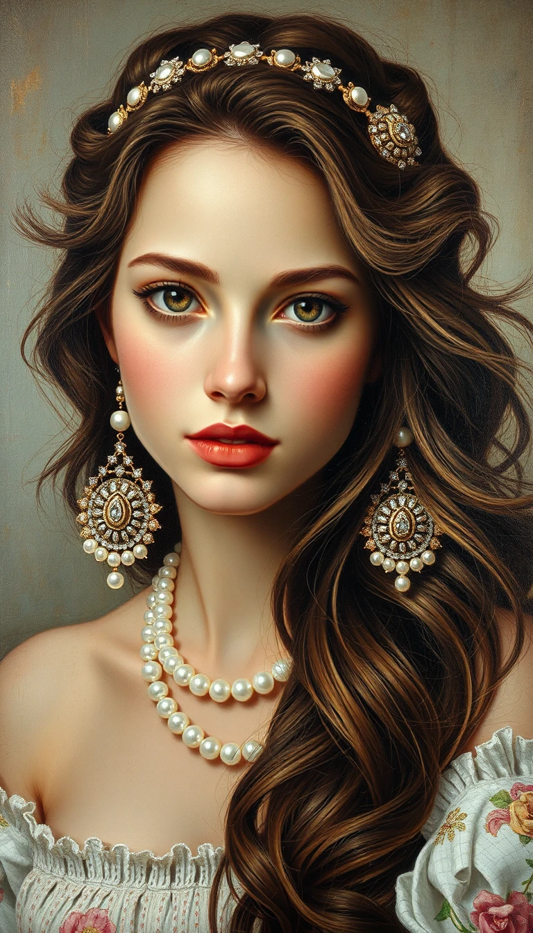 oil paints, Style of Leonardo da Vinci, impasto, wide shot, Style of Hieronymus Bosch, impasto, inspired by the style of Milo Manara, pale skin typical of people with Hispanic descent, Style of Pieter Bruegel the Elder, oil painting, Style of Michelangelo da Merisi, oil painting, Style of Michelangelo Buonarotti, impasto, Style of Michelangelo Merisi da Caravaggio, depicts a captivating portrait of a beautiful woman with intense golden brown eyes, Style of Joseph Mallord William Turner, intense golden brown eyes, Style of Édouard Manet, intense golden brown eyes that stare at the viewer, vibrant pearl and white dress which is richly embroidered and has off the shoulder sleeves, Style of Gustav Klimt, her long and wavy hair is brown with a dark brown undertone, Style of Max Ernst, her brown hair is adorned with intricate white and pearl jewelry including large earrings and a decorative headdress with precious stones, Style of Mark Rothko, the wind gently ruffles her hair causing her locks to float in the air and unruly strands of hair to cross her beautiful face, Style of Grace Hartigan, dynamic and lively mood, Style of Vasudeo S. Gaitonde, her lips are full and slightly parted, Style of George Stubbs, she wears many fine handcrafted pearl bracelets on her wrists, Style of Rembrandt van Rijn, her hands are decorated with detailed henna patterns and she is wearing a vibrant pearl and white dress which is richly embroidered and has off the shoulder sleeves, Style of Jacques-Louis David, her dress is loose fitting and lightweight, Style of Diego Velázquez, she is attractive and captivating, Style of Johannes Vermeer, the lighting is warm and soft, Style of James Abbott McNeill Whistler, there is a golden glow on her tanned skin, Style of Alexandre Cabanel, the intricate textures of her outfit and jewelry add to the richness and cultural depth of the image, Style of Andrew Wyeth, there is a sense of beauty in the image, Style of Claude Monet, Style of Vincent Van Gogh, Style of Salvador Dalí, Style of Edvard Munch, Style of Sandro Botticelli, Style of William-Adolphe Bouguereau, Style of Paolo Veronese, Style of John Constable, Style of Jan Van Eyck, Style of Francisco de Zurbarán, Style of Grant Wood, Style of Paul Cézanne, Style of Georges Seurat, Style of Georgia O’Keeffe, Style of Pablo Picasso, Style of Gustav Klimt, Style of René Magritte, Style of Frida Kahlo,