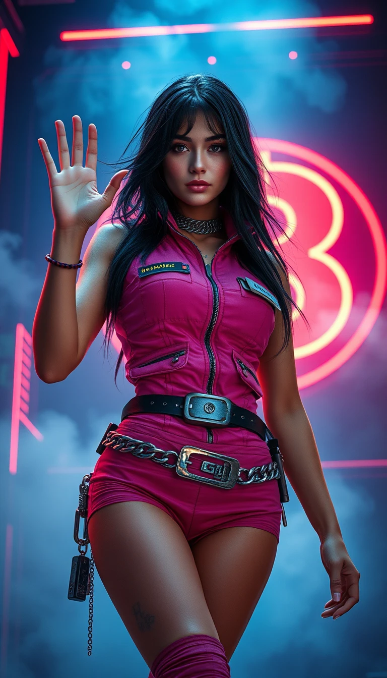 Create a high-end sci-fi stunning photorealistic image of a woman, a cyberpunk heroine. She is beautiful Persson and she is waving at us, altought she is not smiling. A great low shot action pose, her black hair flowing behind her. She wears a cutting-edge pink vest with intricate chains, and text labels. Attached to her waist are elaborate metallic belt. The background is blue with red-neon lights. Smoke, shadows, and reflections enhance the atmosphere, making the scene feel cinematic and alive. A bitcoin logo in background.