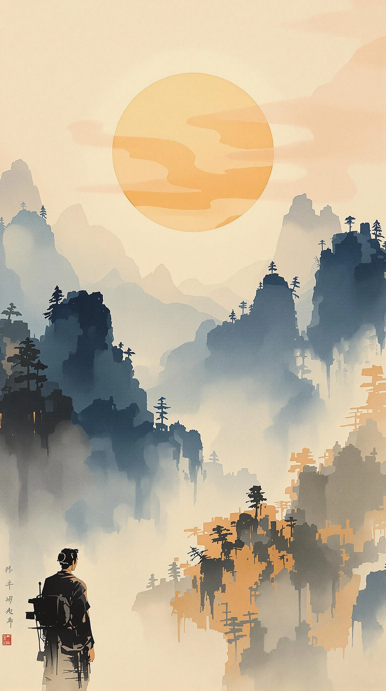 Traditional Chinese landscape painting in Zhang Daqian's signature splashed-ink style. Single contemplative figure silhouetted against a glowing sunset orb, positioned according to classical Song Dynasty compositional principles. Vast misty sky rendered in subtle gradients of indigo, ochre, and pale rose. Ethereal atmosphere created through Zhang's characteristic splashed-ink technique (pocai), with controlled accidents in mineral pigments. Landscape elements: distant mountains dissolving into mist, subtle pine trees, suggestion of water below. Color palette: deep indigos, burnt siennas, muted golds, with strategic touches of mineral blue-green. Brushwork varying between precise figuration and abstract expressionist splashes. Technical elements: traditional ink and mineral colors on silk or paper, visible texture of materials. Composition: dramatic empty space (liu bai) emphasizing atmospheric perspective. Scale: traditional hanging scroll proportions. Mood: profound solitude and connection with nature. Style fusion: classical Song Dynasty refinement with Zhang's modernist abstractions.